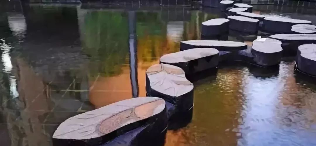 3、水中汀步應(yīng)盡量親近水面,營造仿佛于水上的效果,盡量避免汀步基座外露。