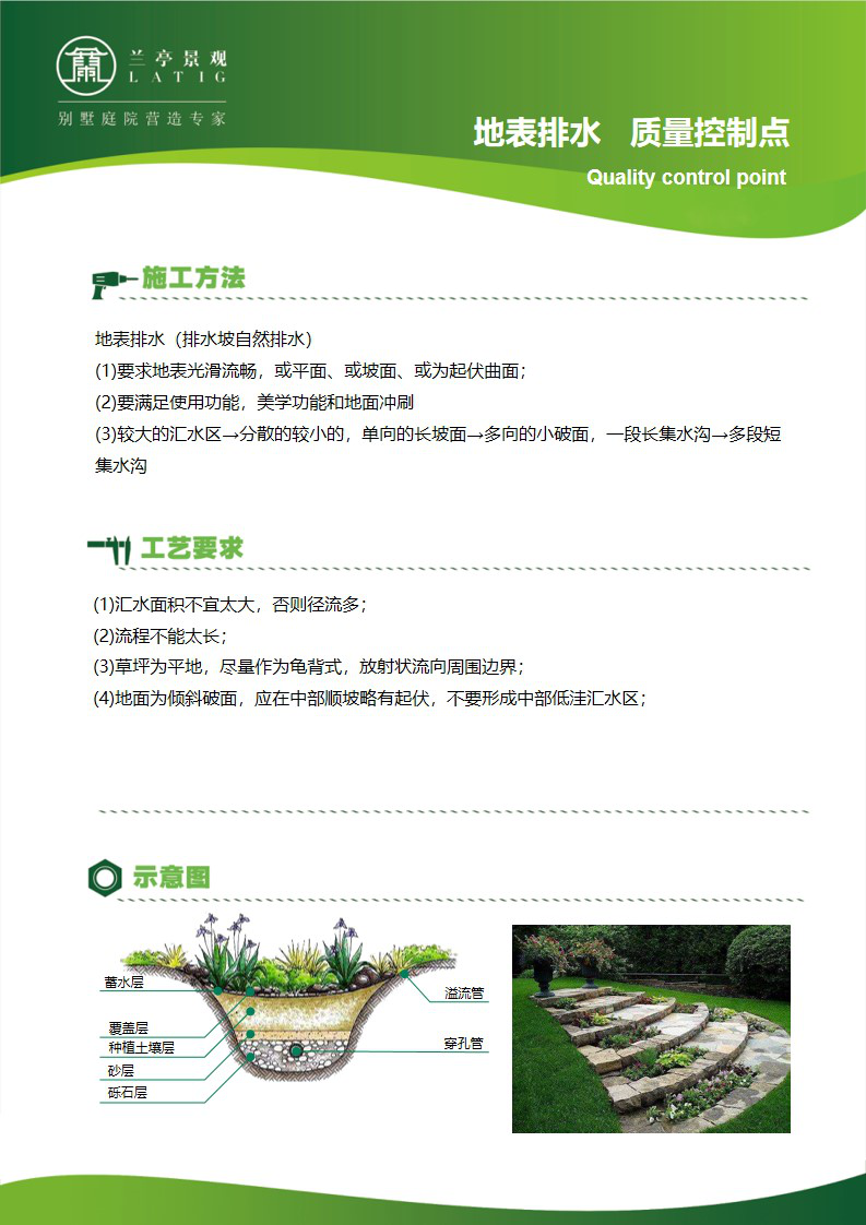優秀的庭院設計并不是想法天馬行空、效果圖花里胡哨,而是扎扎實實的用心設計,“好用,好看,好玩”這一直是蘭亭景觀的追求。包括庭院快速排水在內的隱蔽工程設計,不僅僅是在考驗一個庭院設計公司的技術水平,更是考驗一個庭院公司的良知。