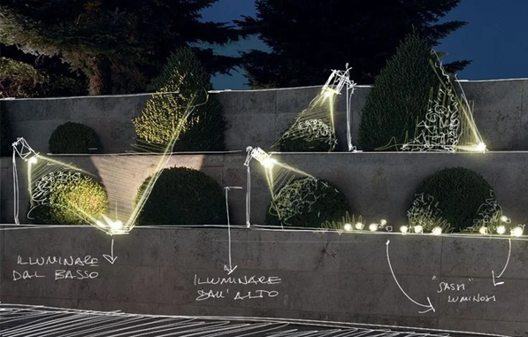 庭院燈光設(shè)計(jì)的裝飾作用可以通過燈具自身的造型質(zhì)感以及燈具的排列組合,對空間起到點(diǎn)綴或者強(qiáng)化作用。