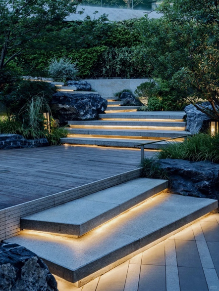 庭院的臺(tái)階照明,要達(dá)到隱蔽燈具,見光不見燈的效果。臺(tái)階燈的形式和布置方法有很多種,可以將臺(tái)階燈鑲嵌在側(cè)墻,也可以鑲嵌在臺(tái)階側(cè)面,既能方便行走,也起到了很好的裝飾作用。