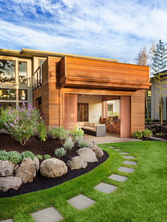 而不規則的汀步也頗有設計感,讓庭院的小道不再單調的同時也能保證草坪植被不被破壞,予人一種別樣的自然體驗。